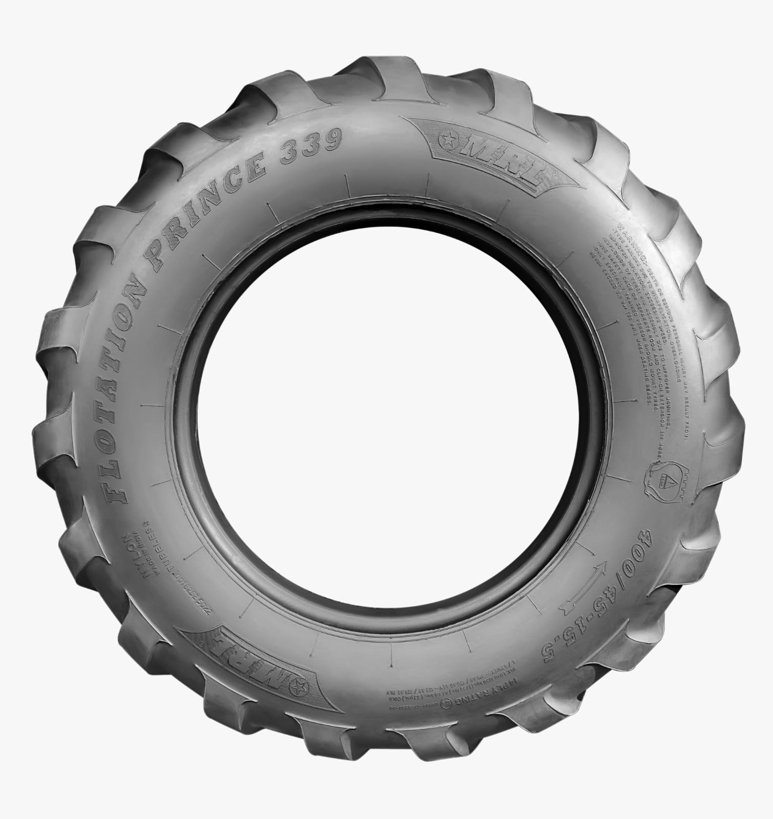 PRINCE 339 is a low sectional height flotation tyres for agricultural implements which features with best traction in soft soil and grass land. It ensures . Its wide tread delivers excellent flotation and self cleaning character. The tyre profile ensures maximum soil protection and low compaction.